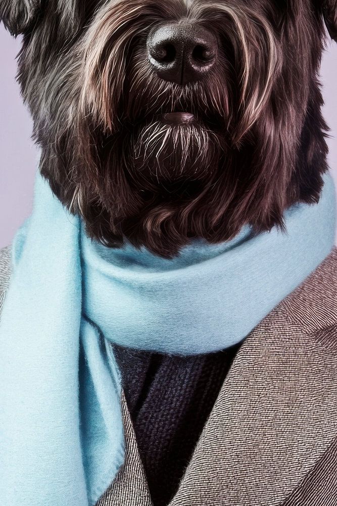 This Bouvier des Flandres presents himself proudly and stylishly in an elegant grey suit, the highlight of which is a soft, light blue scarf. With his thick, fluffy fur and expressive eyes, he radiates a charming mixture of dignity and playfulness. A true gentleman on four paws!