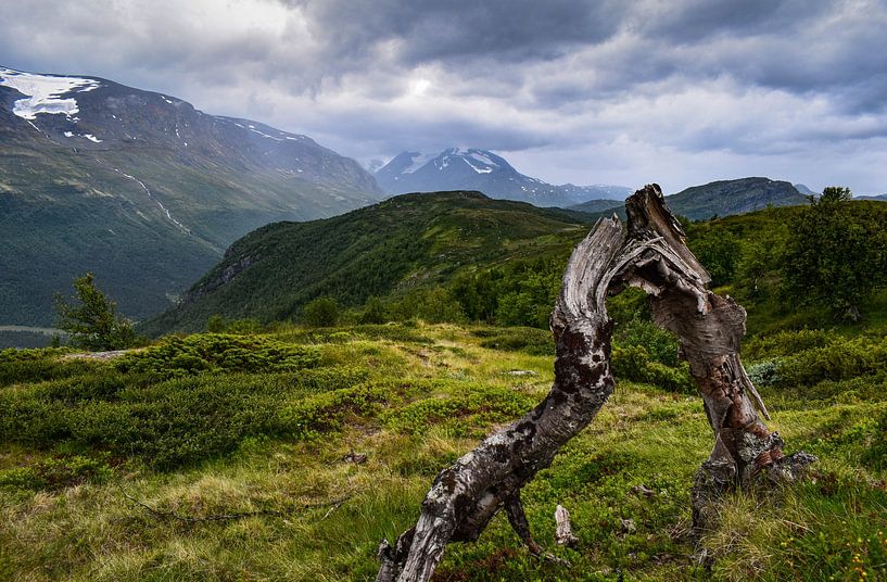 View of the snow-covered peaks of Jotunheimen from the summit of Mount Rustadkampen, in southern Norway.