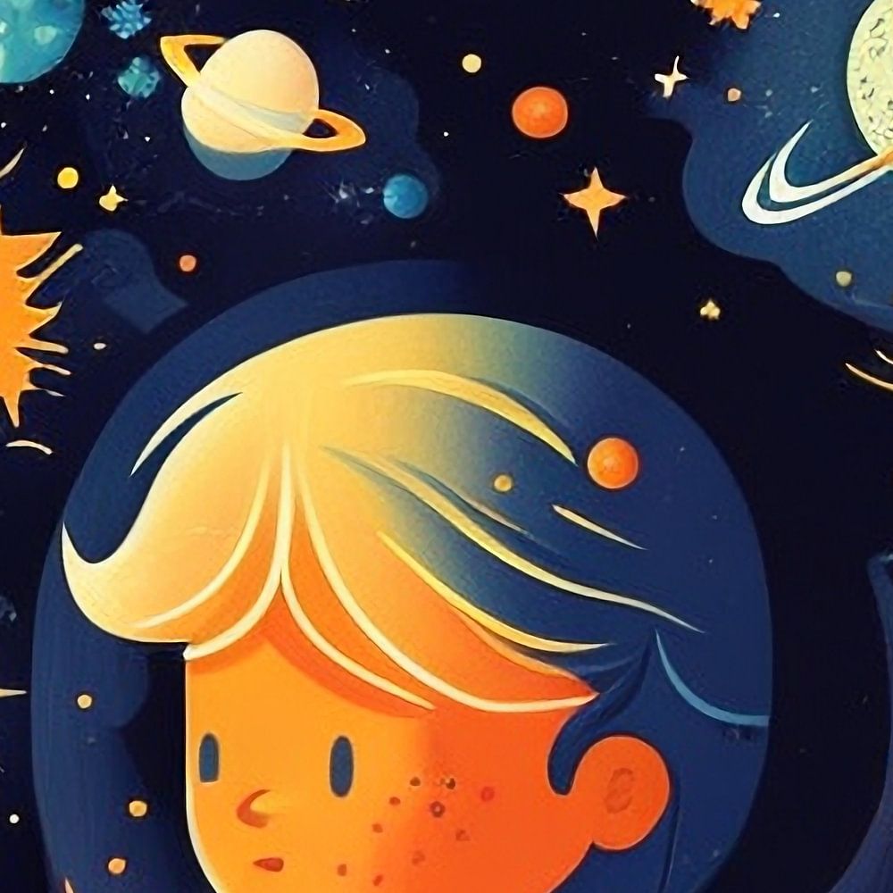 A charming, high-resolution flat vector illustration featuring the head of a blonde-haired boy in an isolated portrait, gazing upwards in wonder. Set against a vibrant space background of stars, planets, galaxies, suns and moons, this artwork combines playful details with a clean, modern aesthetic. The boy's expression expresses curiosity and awe, surrounded by colourful celestial objects that enhance the dreamy, imaginative mood. The seamless, flat design with bright, bold colours and clean lines is perfect for children's products, educational materials or whimsical wall art.
