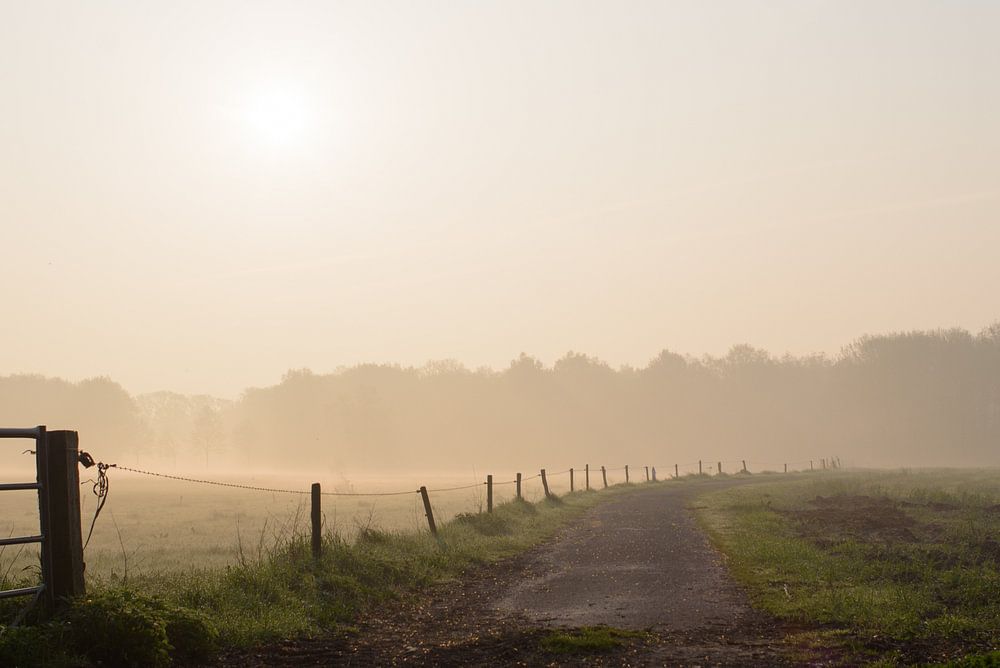 View on a farmers landscape in Brabant, during sunrise. Beautiful morning light above a road between the meadows, with an old farmers fence at the beginning.