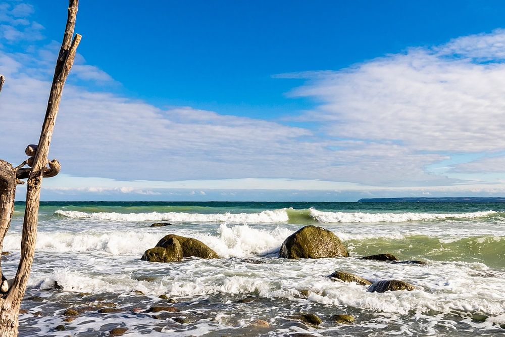 Branch sculpture and waves on the pebble beach of Cape Arkona on the island of Rügen.