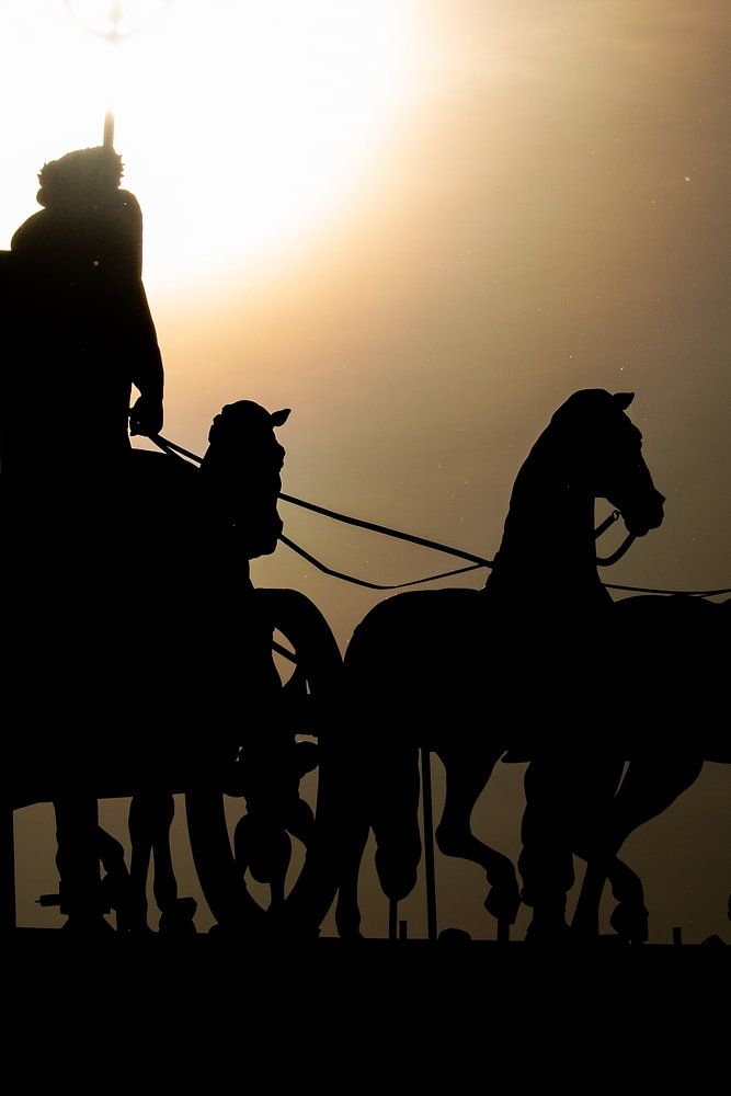 The Brandenburg Gate stands out as a hard and dark silhouette against the setting sun.