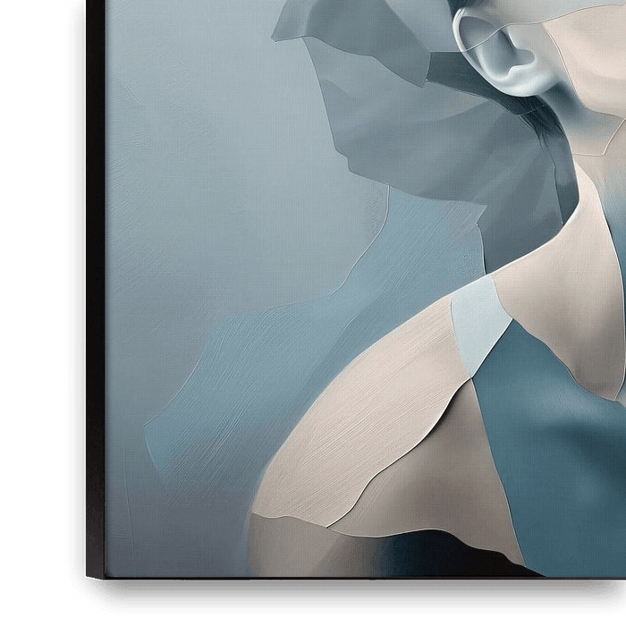 Abstract surrealist portrait of a woman in soft blue,grey and natural tones.