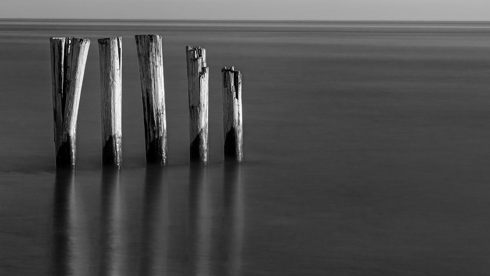 A breakwater on the west coast of the Dutch island of Ameland near Hollum beach. The black and white photo was taken at high tide at sunset, with a long shutter speed.