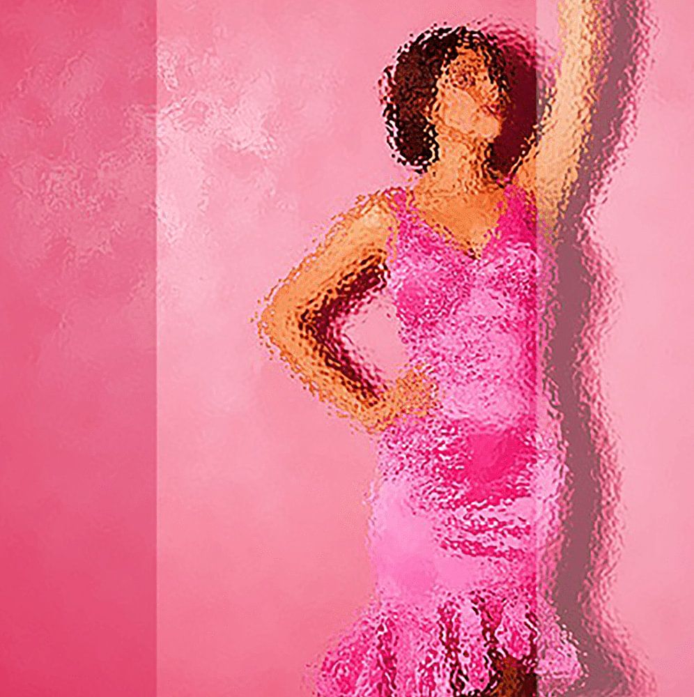 A beautiful portrait of a woman in shades of pink/red. If you look from afar, the model seems to be holding her own, but the closer you get to the work, the better you can see that the model seems to slowly dissolve into the background.
