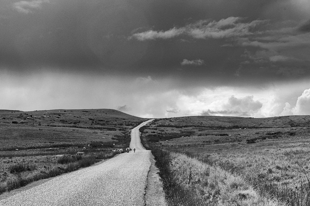 Nr Llandeusant Brecon Beacons Wales UK A mountain road leads into the distance with rainclouds clearing to reveal sun.