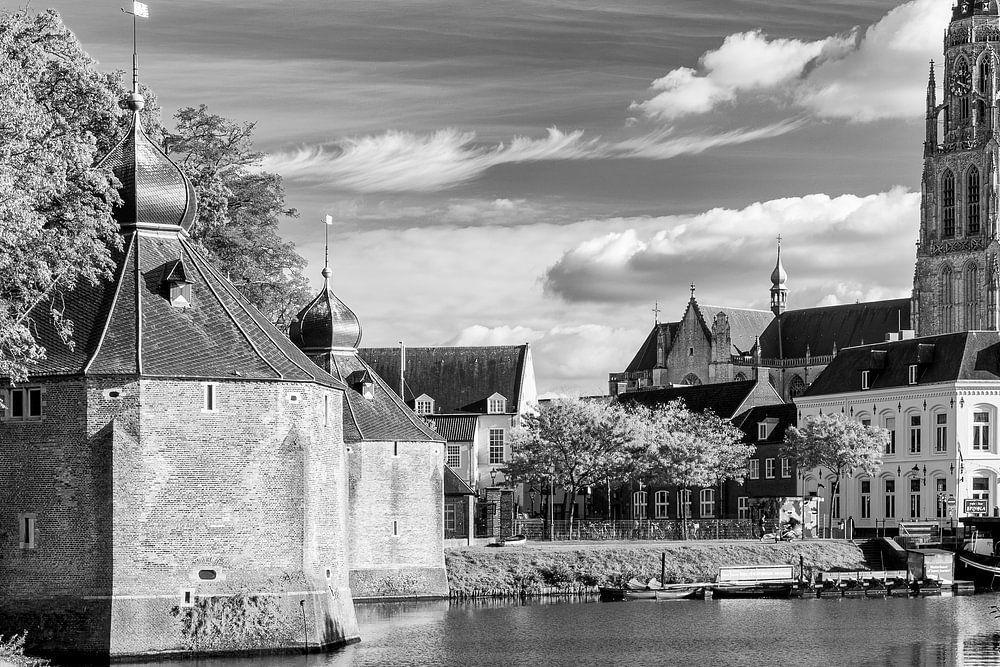 A detailed reproduction of Breda Spanjaardsgat, photographed from the Prinsenkade. A popular place to show this beautiful historical part of Breda. Every season gives a new look. This time in early autumn, on a warm and sunny day. Later in the afternoon some cloud fields passed behind the Great Church. For the photo this gave a nice…