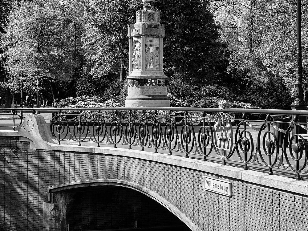 A beautiful spring day at the entrance to the city park Valkenberg in Breda. Nowadays a nice connection between Breda station and " the best city centre of the Netherlands". The Baroniemonument stands as a beacon at the entrance of the park. The lively and well-maintained city park that can provide hours of rest and fun during such a day. That's why it's worth a photo to hang on the wall as a showpiece. And of course in characteristic black and white to underline the historical character!