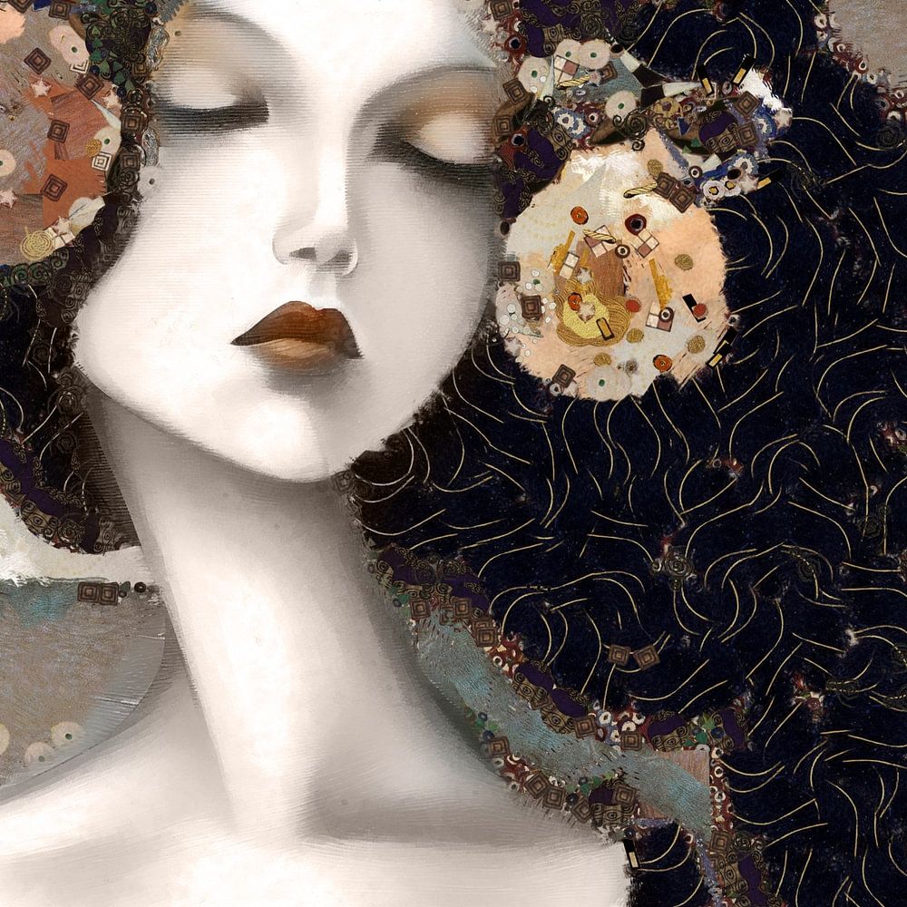 Abstract portrait of a woman with closed eyes and flowers in her hair, with painting patterns in the style of Gustav Klimt. The composition features rich, soft earth tones and a textured background.