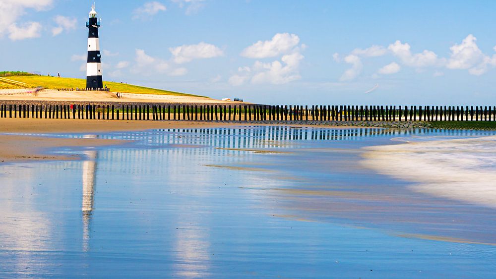 Beautiful lighthouse of Breskens in the radiant sun, seen from the surf.