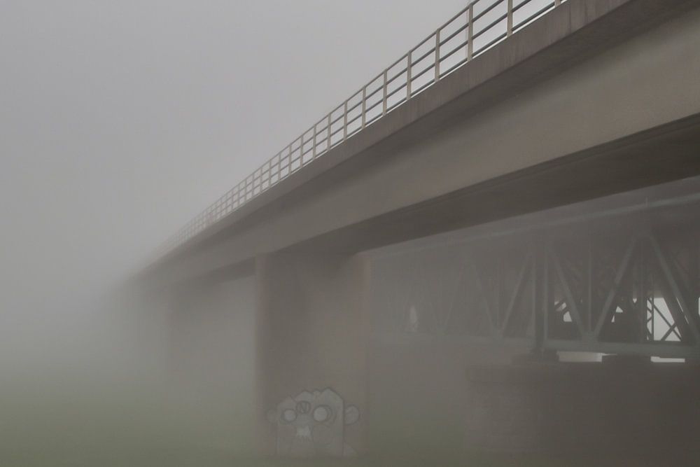 The Westervoort bridge, not visible anymore because of the fog. The streetname is the BrugWeg.