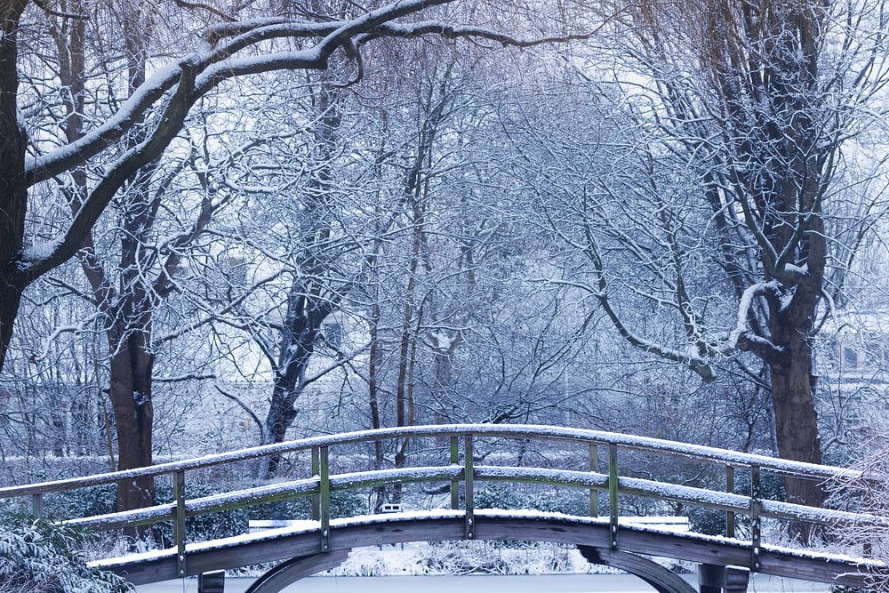 This is the Major Bosshardt Bridge in Broerse Park in Amstelveen. The winter setting with snow makes it extra beautiful. I took this photo with a zoom lens (RF 100-500). It has a romantic feel to it and the shape of the little bridge makes for a fine composition.