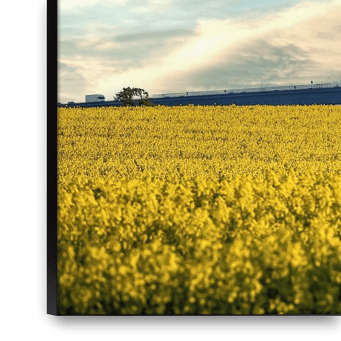 The Fehmarnsund Bridge, affectionately known as the "coat hanger", connects the mainland with the Baltic Sea island of Fehmarn and is a technical and scenic landmark of northern Germany. In this atmospheric motif, the elegant steel arch construction spans a bright yellow rapeseed field - a symbol of spring, expanse and connection. The…