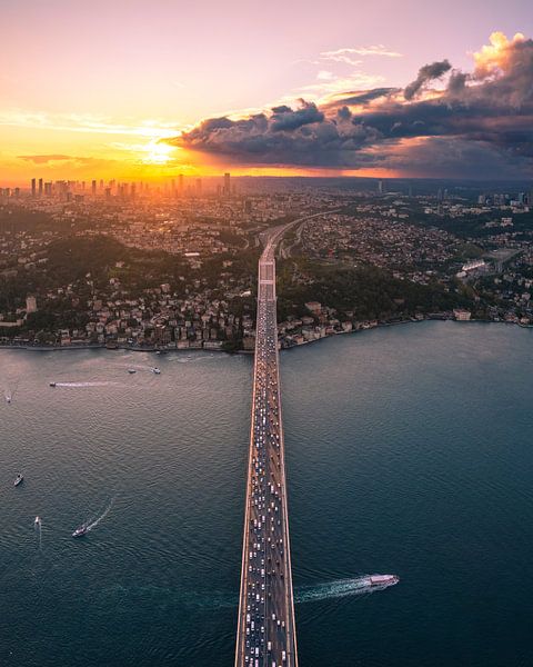 This aerial photograph shows an iconic bridge in Istanbul connecting the banks of the Bosphorus, captured at sunset. From the drone's perspective, the bridge stretches straight across the water, while traffic is visible as a continuous stream of light and movement. The setting sun colours the sky in warm shades of yellow, orange and…
