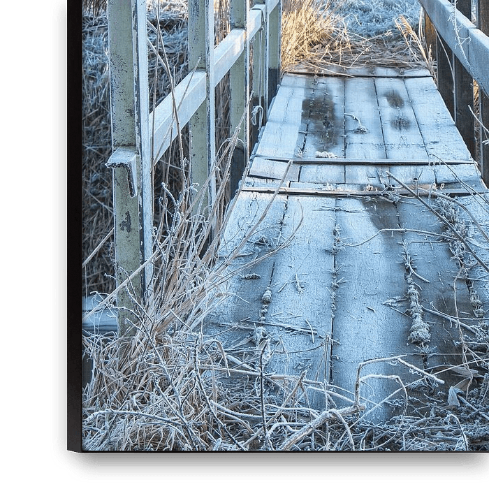 It is quiet over the fields. A wooden frozen bridge leads to the silence.