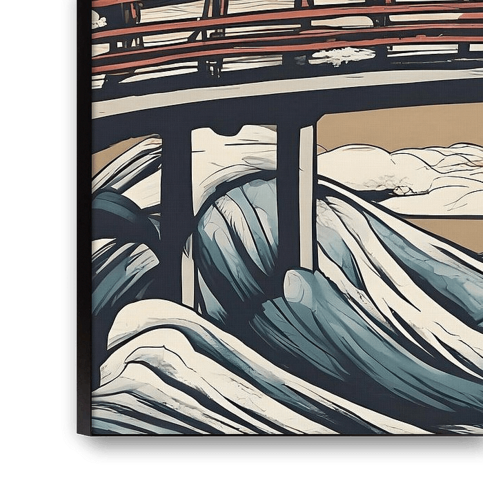 A temple near wild water. Inspired by japanese woodblock. In Kyoto, a city steeped in history and spirituality, there are countless temples to explore. Created through AI.