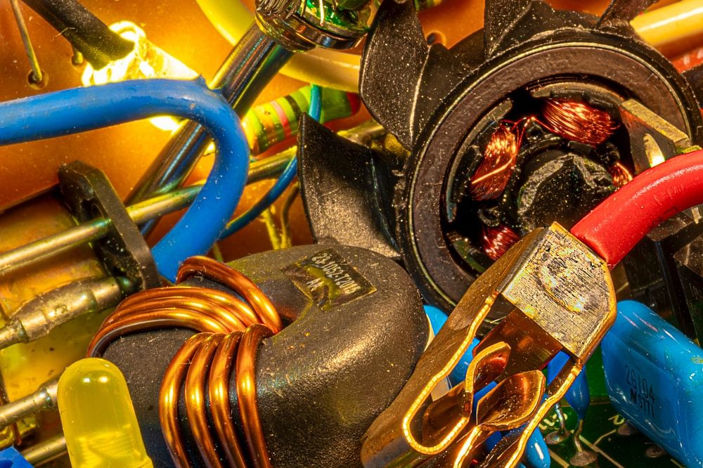 This picture captures the heart of technology: a dynamic tangle of wires, coils and components crossing and connecting, with a subtle hint of smoke creating the illusion of a short circuit.