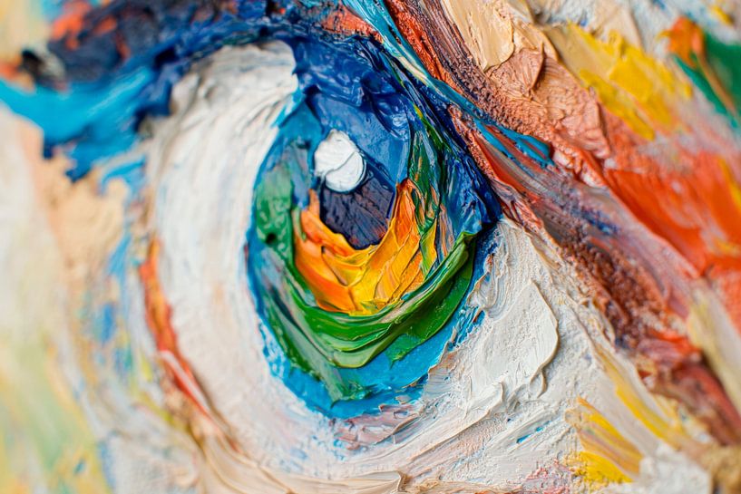 The eye unfolds in a fascinating swirl of colours, as if it holds the secrets of the world within it. The vibrant, impressive shades of blue, green and orange lend the eye a mesmerising depth. Ideal for a living room or creative study, it radiates vibrant energy and inspiring creativity.