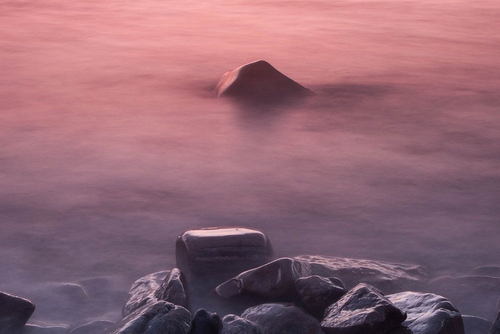 Bright pink sunset on lake baikal, stones in the foreground, long exposure by Michael Semenov
