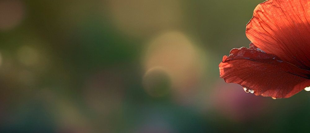 A delicate, red petal shines in soft light and attracts the eye with its filigree beauty. Surrounded by a blurred green background, it conveys a sense of calm and closeness to nature. Perfect for the bedroom, it creates a harmonious atmosphere that promotes relaxation and peace.