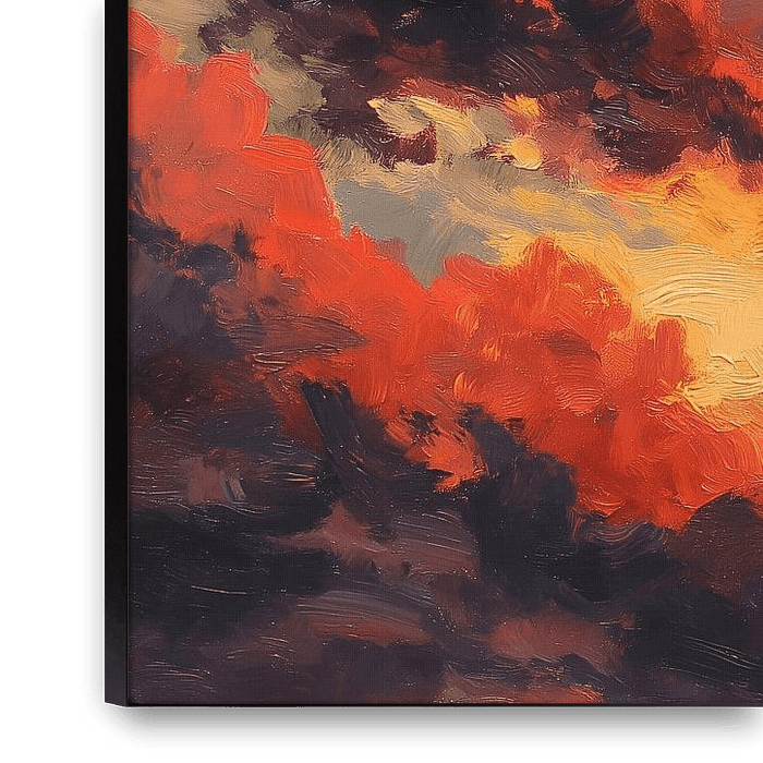 This expressive artwork depicts a dramatic sky filled with glowing clouds in the warm evening light. Intense reds, oranges and golds blend with darker shadows to create a powerful, emotional atmosphere. The impressionistic painting style lends movement and depth to the sky, capturing the fleeting beauty of a spectacular sunset.
