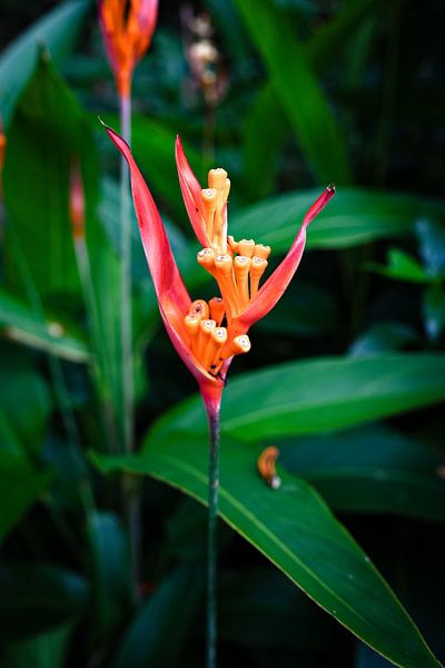 This photograph features a tropical flower with slender forms and vibrant colours, standing out elegantly against a background of dense, deep foliage. The orange-red petals, enhanced by yellow hues, are an immediate eye-catcher and create a striking contrast with the intense green of the surrounding broad leaves. The vertical…
