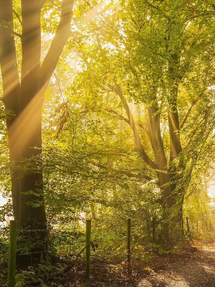 The sun cautiously breaks through the mist covering the fairytale forest. Slowly the mist lifts, the sunlight penetrates between the branches in more and more places and begins to fall on the path. In the distance, the light is still hazy due to the moisture in the air.