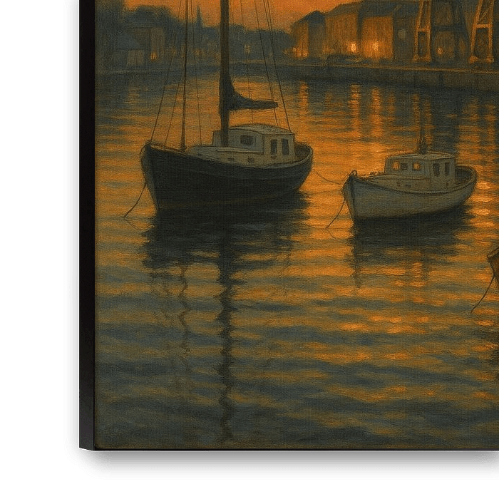Bristol Harbor Glow captures the poetic quiet of Britain’s maritime soul at the very moment day turns to night. The familiar outlines of cranes and moored boats soften beneath a wash of molten gold and indigo, while the rippled water mirrors the city’s last breath of sunlight. Every line and reflection carries the emotional stillness of Edward Hopper’s atmospheric realism, where human presence is felt not through figures but through light itself. Here, industry becomes introspection: steel, glass, and tide transformed into calm geometry and luminous silence.