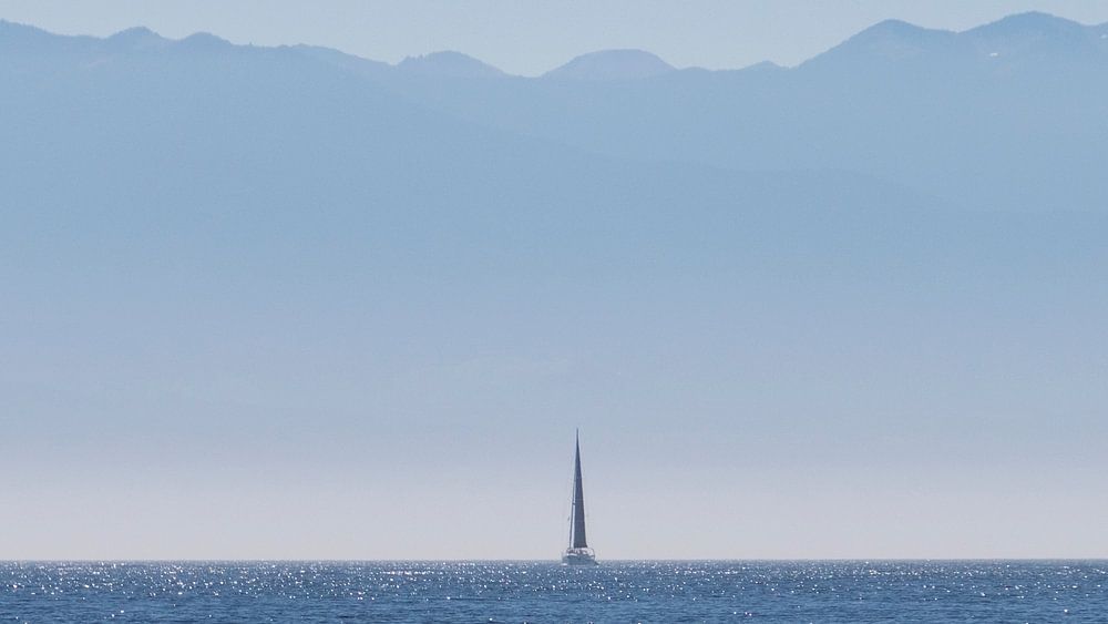 A sailing ship on the horizon in the waters surrounding Vancouver Island. Mountains in the background a layer of fog just above the water, almost fairy-like. What peace and serenity.