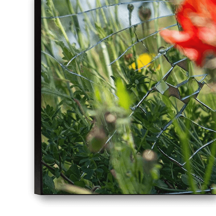 This is a highly dynamic and conceptual image that forces the viewer to see two realities simultaneously: a lush, sunny summer garden full of poppies, and the sharp, abstract lines of broken glass in the foreground. The pink and yellow flowers are fascinatingly broken, mirrored and distorted by the shards, creating a kaleidoscopic, fragmentary effect. The sharp edges of the glass contrast sharply with the soft, organic shapes and colours of the flowers.