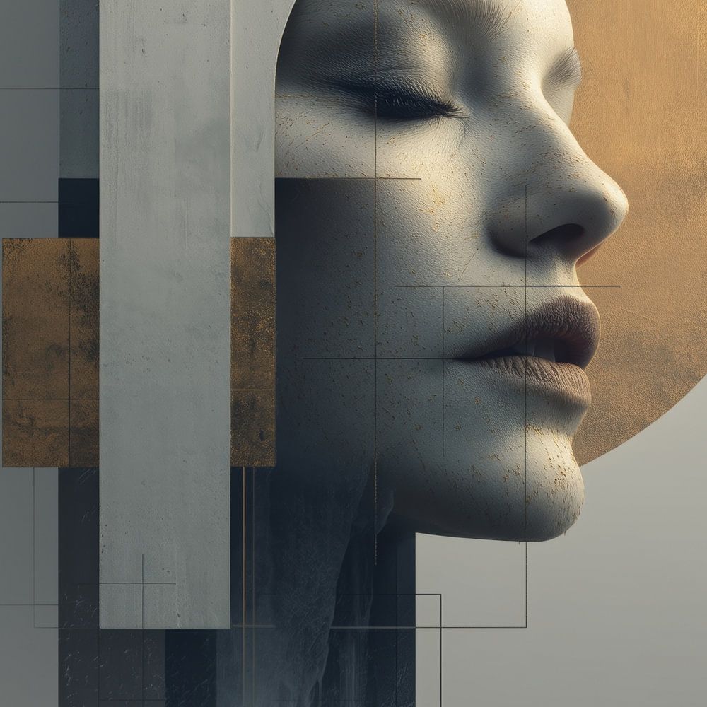 The composition of the picture skilfully plays with overlays and transparencies, creating depth and movement. The geometric elements are reminiscent of cubist influences, while the realistic depiction of the face creates a modern contrast. This complexity makes the work a meditative eye-catcher that invites prolonged contemplation.