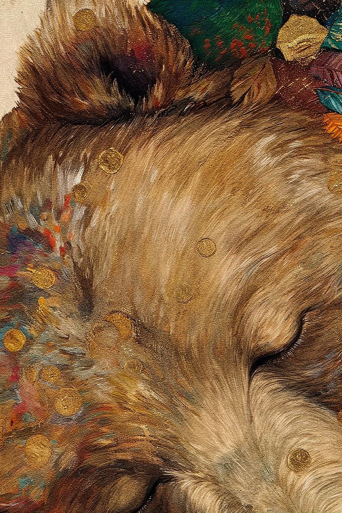 In the silent forest, Brom the bear lies snoring, so loudly that the leaves tremble to the rhythm of his lullaby. Watchman the kingfisher, seated on his furry back, keeps watch. He knows that when Brom wakes up, the forest will be full of happy tales of his dreams. "Stay asleep a little longer," chirps Waker, "the dreamfish haven't been caught yet!" And together they share the gentle moment of an afternoon nap in the forest.