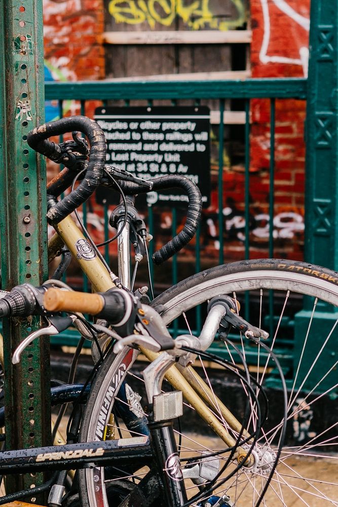 Bicycles parked near a subway station in the Greenpoint neighborhood of Brooklyn, New York.