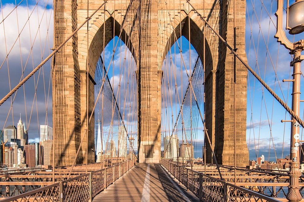 Early morning after sunrise on the deserted Brooklyn Bridge in New York.