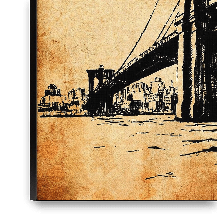 A black and white sketch of the Brooklyn Bridge, rendered in a vintage style on a textured, aged paper background. The bridge's iconic suspension cables and towers are prominently featured, with the cityscape of New York City visible in the background. The image evokes a sense of history and nostalgia, capturing the bridge's enduring…