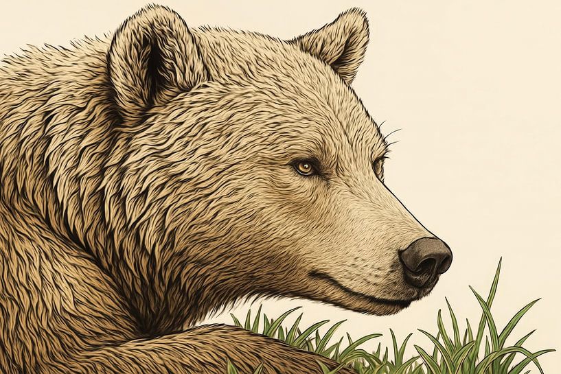 A calm brown bear in side view rests among short blades of grass. Fine lines draw the soft fur, while subtle shadows give depth to muzzle and ear. Warm earth tones contrast with the cool green creating a serene balance. The gaze, slightly reflective, provides focus without being overpowering. The composition is tight and harmonious,…