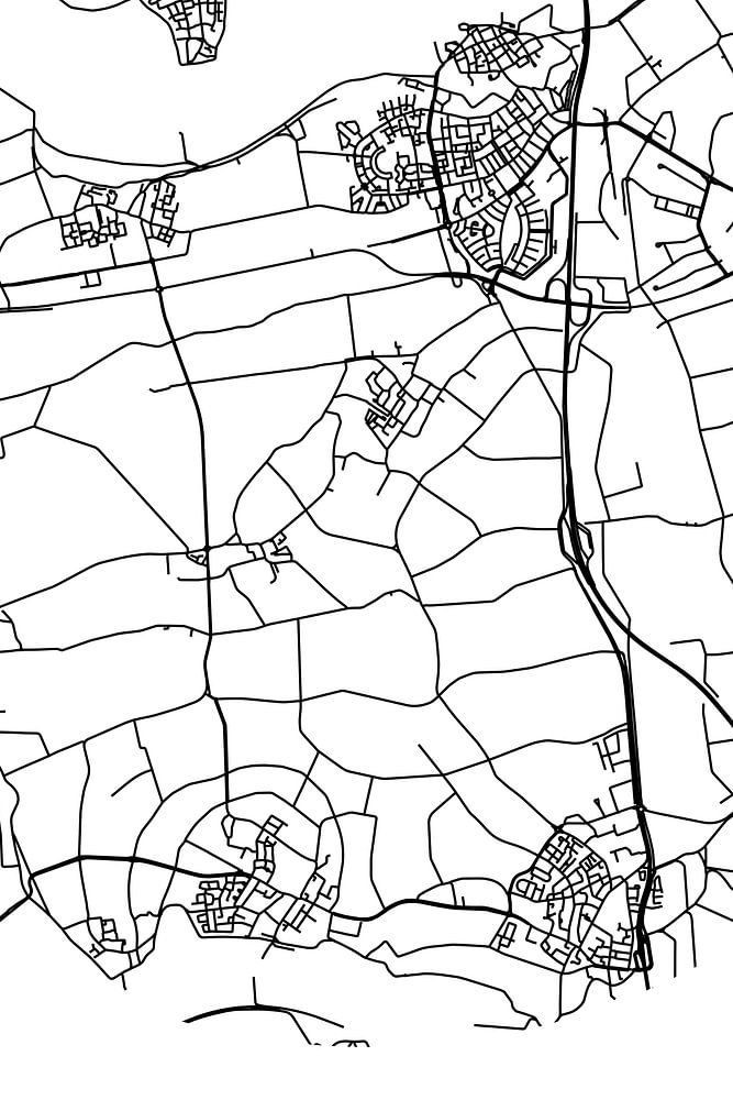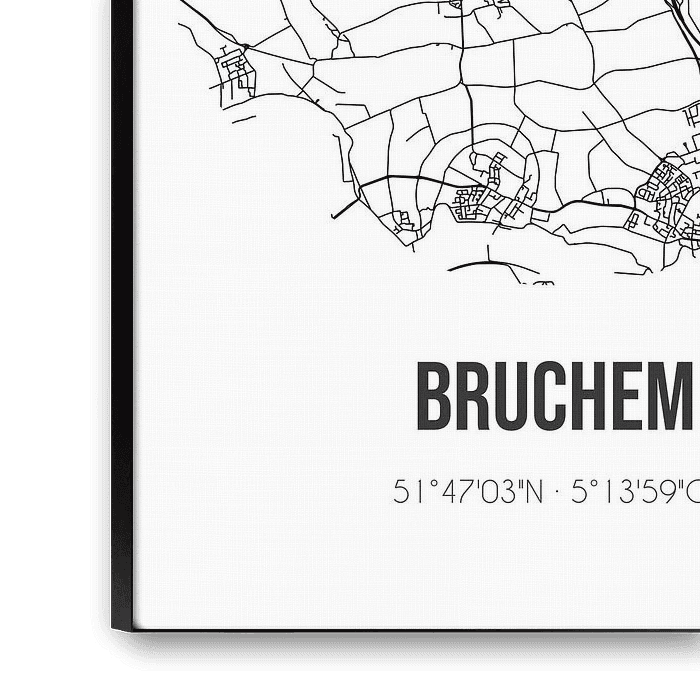 Black and white map, street map or street plan of Bruchem. Bruchem is located in the Betuwe, in the municipality of Zaltbommel, province of Gelderland. On the city map all public roads in Bruchem are included. Furthermore, the map is provided with the coordinates of the center of Bruchem.