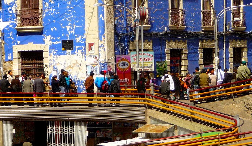 Huizen, reclame, brug en mensen in La Paz, Bolivia.