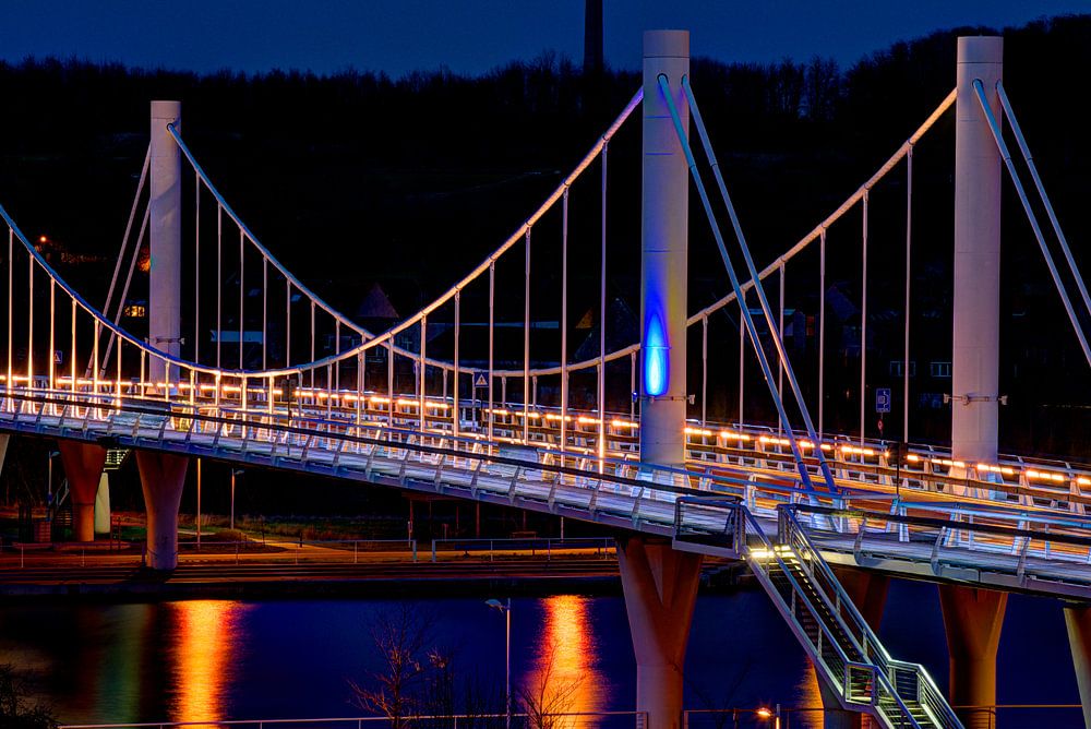 prachtige bouwwerk en mooi verlicht, doet deze brug van een prachtige gloed voorzien in het donker.
