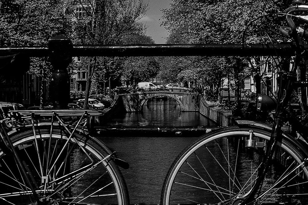 Typisch Amsterdams. Fietsen geketend aan de reling van een brug van een gracht.