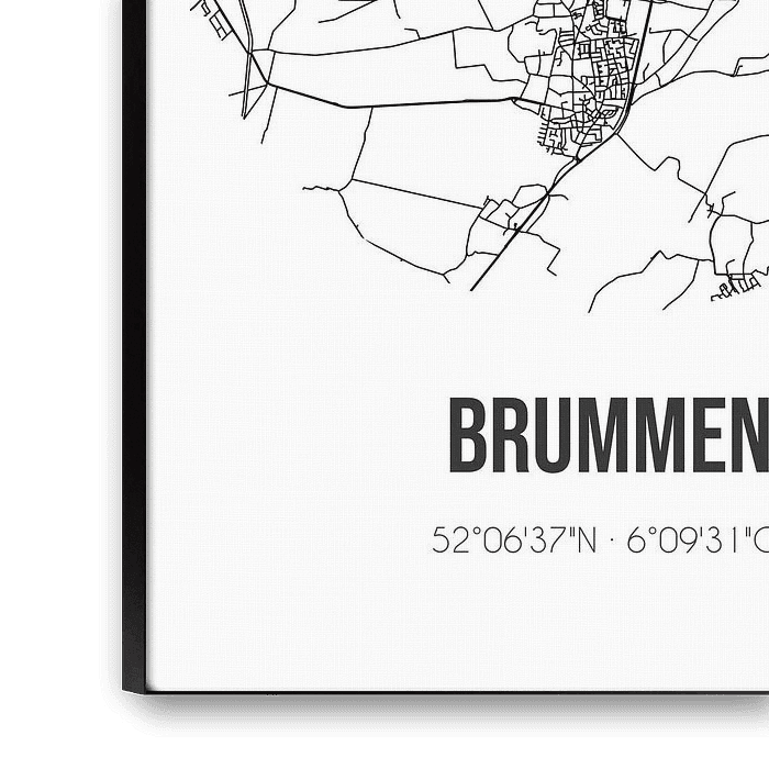 Black and white map, street map or street plan of Brummen. Brummen is located in the municipality of Brummen, province of Gelderland. The city map includes all public roads in Brummen. Furthermore, the map features the coordinates of the center of Brummen.