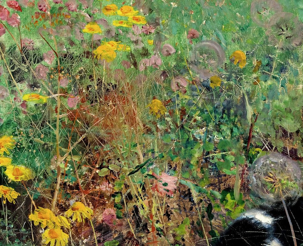 Bruno Liljefors,Cat on a flowery meadow, painted in 1887