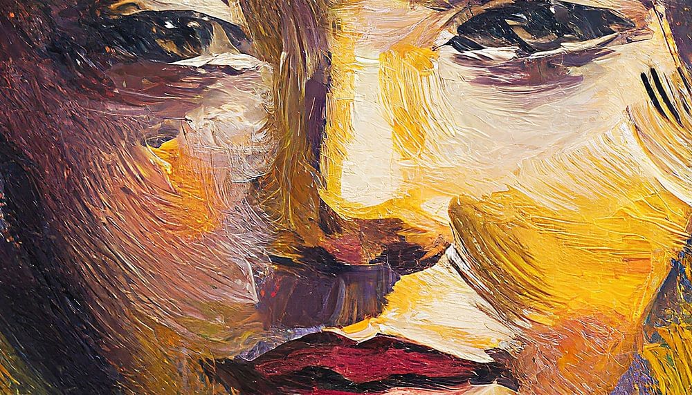 Bold short brushstrokes in vintage old-fashioned colours from which a calm and intriguing face emerges with soft facial expression like an abstract sketch.