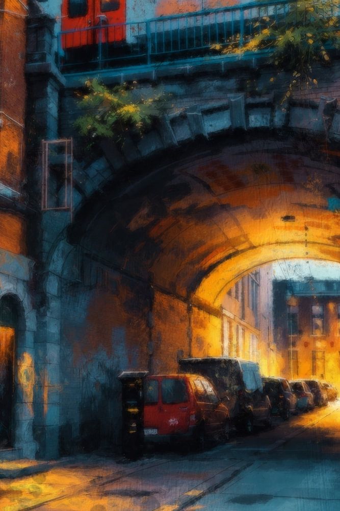 This atmospheric digital painting brings a characteristic Brussels street scene to life in a contemporary, graphic style. The stark contrast between warm highlights and deep, cool blues creates a cinematic composition that immediately captures the eye. The scene, inspired by an urban passageway with a railway bridge, exudes the…