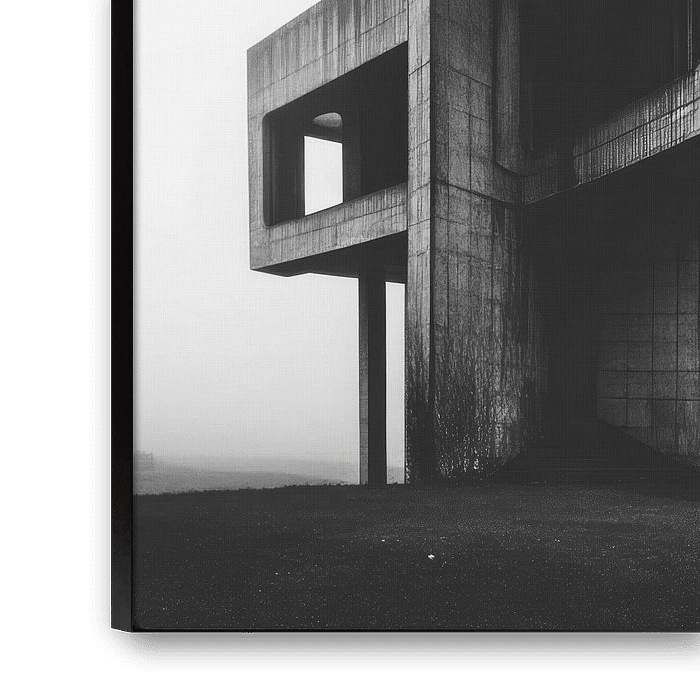 A powerful black-and-white portrait of an imposing brutalist structure rising out of the mist like a forgotten monument. Its rough concrete forms and dramatic lines emphasise the architectural beauty of abandoned modernism. This image exudes an air of mystery, alienation and power, perfect for lovers of abstract architecture, minimalism and post-apocalyptic aesthetics.