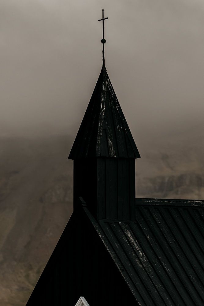 Budakirkja, Iceland's famous black church on the Snaefellsnes peninsula, stands out beautifully here against a misty mountain landscape. The minimalist contrast of the dark wooden facade with the white door and windows exudes the calm and simplicity of Nordic design. This Nordic wall decoration brings a serene and timeless atmosphere to any interior.