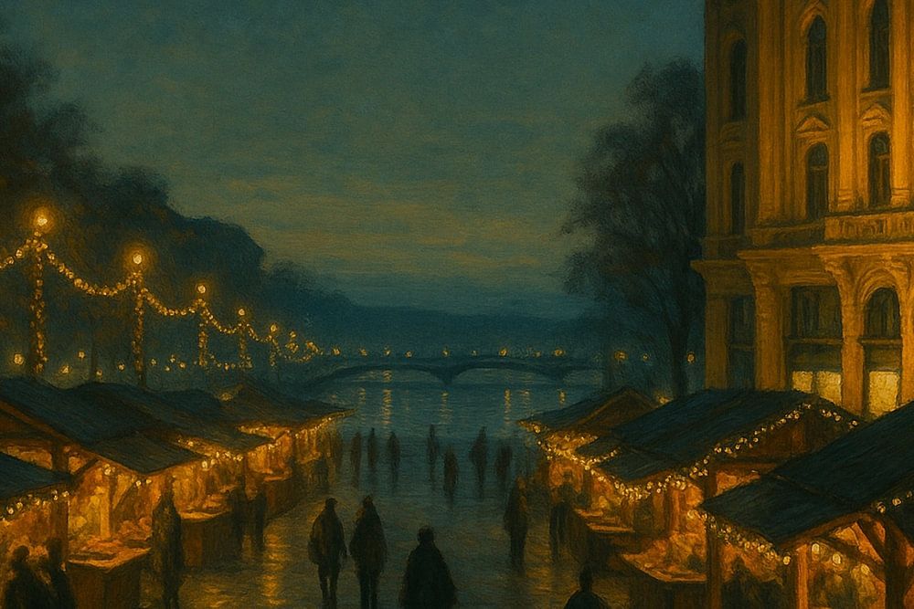 This painting captures the elegant charm of the Budapest Christmas Market, set along the Danube River where warm light meets architectural grace. Wooden stalls stretch beneath strings of golden bulbs, reflecting off the cobblestone streets still damp from evening frost. The air glows softly as silhouettes of visitors move among the lights, their quiet figures framed by the city’s historic facades and bridges shimmering in the distance.