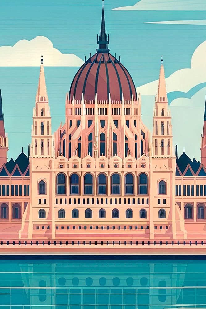 The Hungarian Parliament rises majestically on the banks of the Danube, its magnificent dome and filigree towers gleaming in soft pastel colours. The sky is calmly reflected in the water, while the silhouette of an observer remains in awe. A harmonious combination of architecture and nature that captures the timeless beauty of Budapest.