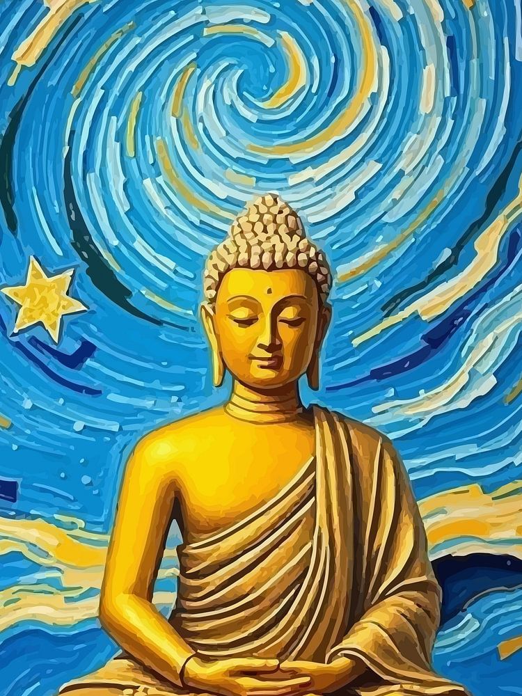 Radiating warmth and cosmic harmony, this vibrant poster blends the serenity of Buddha with the swirling brilliance of Van Gogh’s *Starry Night*. The golden Buddha sits peacefully above a bed of radiant sunflowers, symbolizing enlightenment, joy, and spiritual energy. The vivid blue sky dances with celestial motion, drawing the eye into a universe of stillness and wonder. A perfect fusion of fine art and mindfulness, this piece brings inspiration, positivity, and tranquility to any space it adorns.