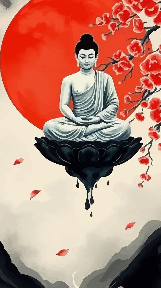 This abstract sumi-e painting captures Buddha’s essence through bold, fluid brushwork, grounded by the eternal symbol of the red sun. Cherry blossoms painted in deep red cascade softly around the composition, their delicate forms offering a counterpoint to the raw energy of the ink. Together, sun and blossoms create a balance of permanence and transience, light and shade. The Japanese aesthetic of harmony and impermanence breathes through the work, making it a statement of spiritual reflection and quiet strength. An artwork both calming and visually powerful.